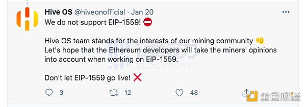 1 月 20 日,Hiveon 正式宣布反對 EIP-1559,Hiveon 表示會站在挖礦群體考慮,希望以太坊開發者可以參考礦工的意見。
