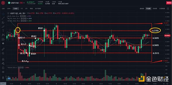 如果市場價格超過了網格區間,訂單則不會被完成。正如下圖所示,在開始網格交易的時段中,USDT/QC價格沒有經過第一個網格(6.3785元),程序無法在這個第一個網格的價格處進行買入,所以第一個買入的訂單在第二個網格上。因此交易者可以在自己認為的K線高峰處(或者低谷)開啟網格交易,這樣網格程序才能更大程度地把訂單布滿。