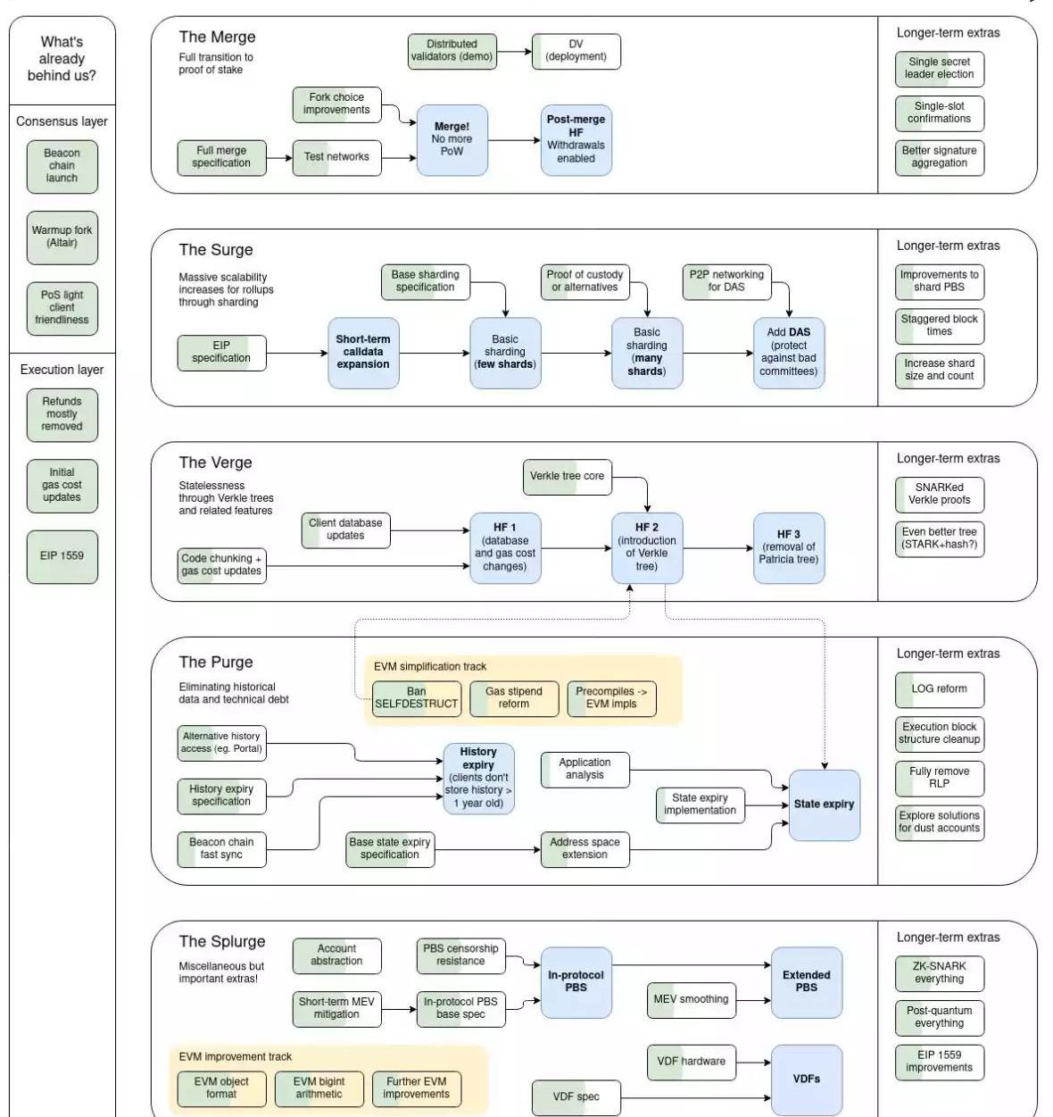 現在,是時候把注意力集中在我們今天所處的位置和將要發生的事情上了。就目前而言,Ethereum已經完成了備受期待的合并,并計劃在未來幾年進行一系列升級。下面這張圖表很好的總結了這些升級的具體情況: