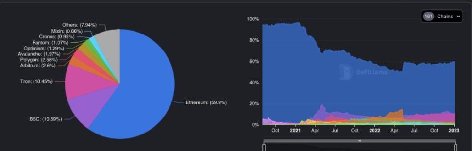 本周TVL小幅反彈,上升0.76B,較上周增幅為1.95%。其中etheruem鏈上的TVL小幅上升0.8%。Layer2的幾條主流公鏈,avalanche、optimism、polygon、arbitrum中均為小幅上漲趨勢。