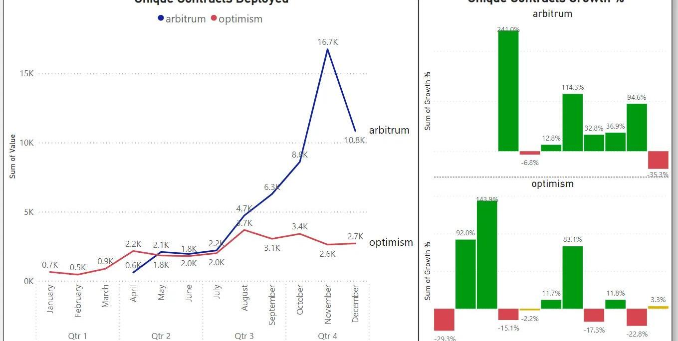 截至2022年12月,Arbitrum是挑戰者類別中唯一一條擁有超過10億美元TVL的鏈。最底部的時候,NEAR的TVL不到1億美元,Cosmos的TVL不到100萬美元。基于DeFilama的數據,Cosmos的TVL完全來自StarFi,一個流動性質押dApp。Cosmos和NEAR在今年下半年持平。沒有新的值得注意的項目引起新的TVL存款的注意。Arbitrum&OptimismM-o-MTVL增長在2022年下半年顯示出放緩跡象。Optimism的TVL在11月份暴跌了約50%。AVAX曾經在TVL($80-90億美元)方面表現強勁,可與領導者類別相媲美,但它在3月份從懸崖上一躍而下,自3AC暴雷之后就再也沒有恢復過來。在今年剩下的時間里,資金逐月流出。2.4部署的唯一合約數量