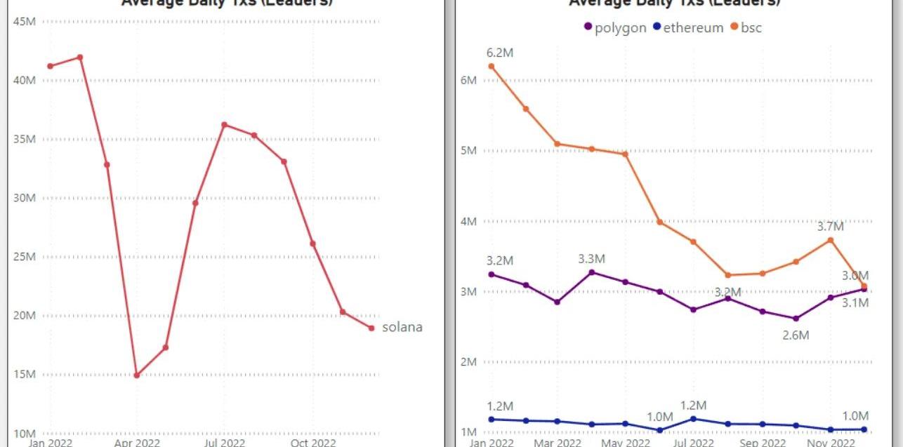 BSC是唯一一條日活躍地址數超過一百萬的鏈。以太坊DAA在400-500k之間,Polygon在300-400k左右。Solana一直處于水深火熱之中,連續8個月出現負增長。Solana的每日活躍地址在2022年12月第一次低于以太坊。Polygon自5月以來緩慢而穩定地復蘇,10月突然飆升55%。飆升可能是由于Reddit在10月份的NFT計劃+他們獲得的成功的web2BD交易浪潮。BSC&Polygon在第3-4季度表現相對較好,在2022年上半年首次刷新后奪回了用戶增長。相對于BSC&Polygon,以太坊在2022年下半年表現不佳,但其放緩趨勢得到了很好的控制。沒有一個月低于-10%。1.2日均交易數量