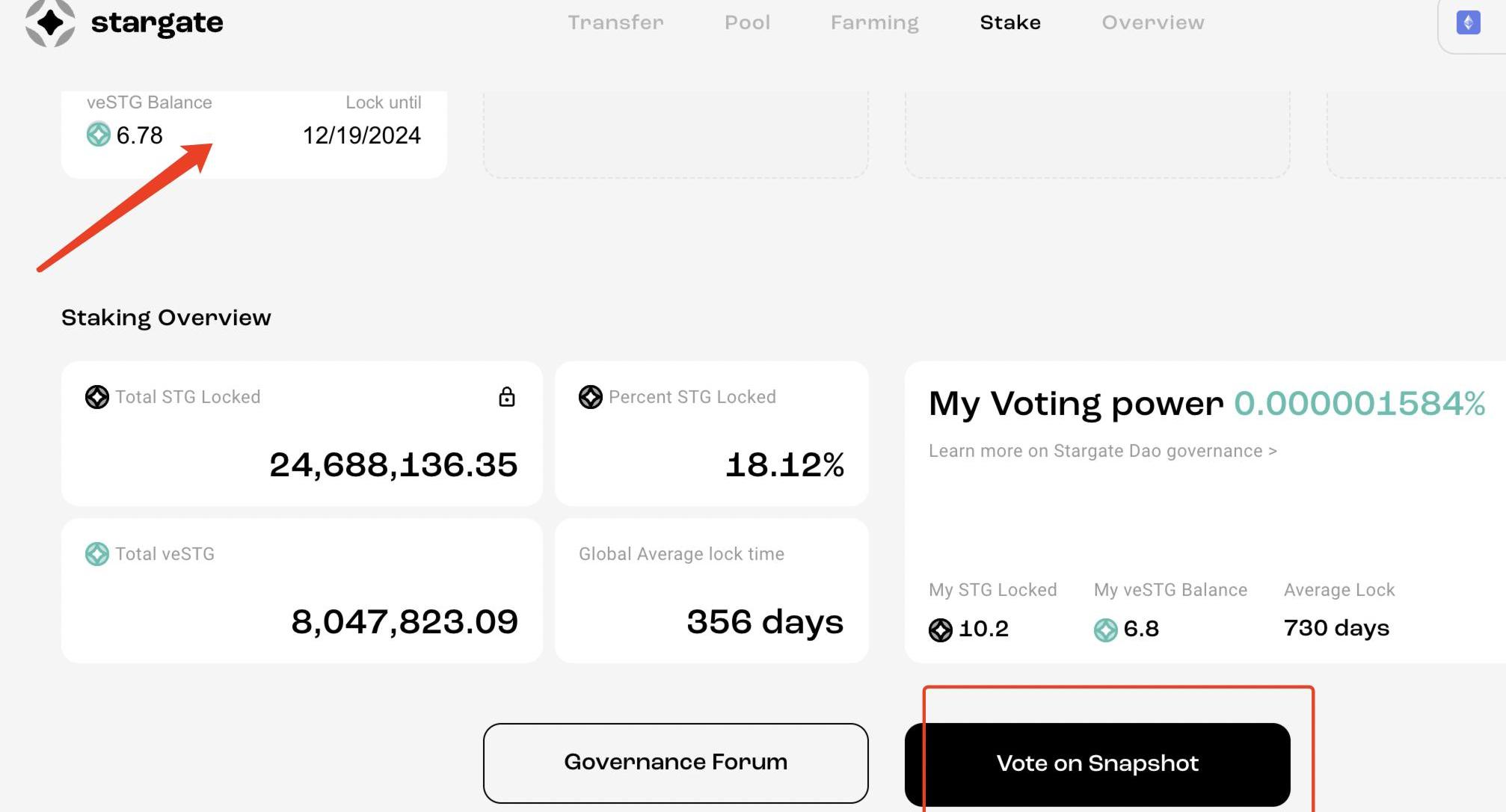 投票完,再點擊“stake”可以看到質押詳細,在“myvotingpower”可以看到投票份額