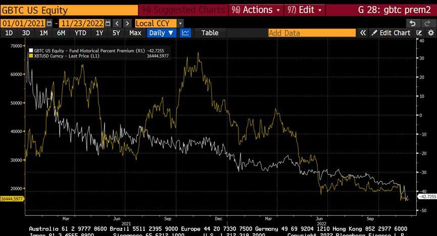 在我們本周開始看到的SBF明顯的史詩般的欺詐行為的后果中,也許最重要的傷亡是加密貨幣貸款機構Genesis可能無力償還和可能破產,這可能是巨大的,足以也使其母公司——著名的風險投資公司DigitalCurrencyGroup倒下。Genesis/DCG的鬧劇——其中還包括Genesis的姐妹公司——數字資產基金Grayscale——特別有影響力,因為它直接影響到在任何交易所上市的最大比特幣投資產品GBTC.GBTC對我們這些加密貨幣交易商如此重要的原因是,它持有最大的比特幣儲量之一。如果投資者——無論是否愿意——被允許用BTC或美元贖回GBTC股份,它可能會引發比特幣和其他狗屎幣的法定價格的下一個殘酷的下跌過程。