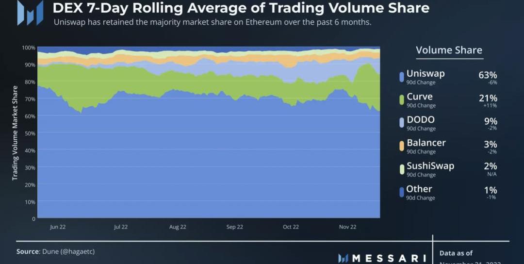毫無疑問,Uniswap是領先的DEX。盡管如此,它的競爭對手——Curve、Balancer和Sushi——都很成熟而且規模很大。每個人都在DEX領域開辟了自己的利基市場。