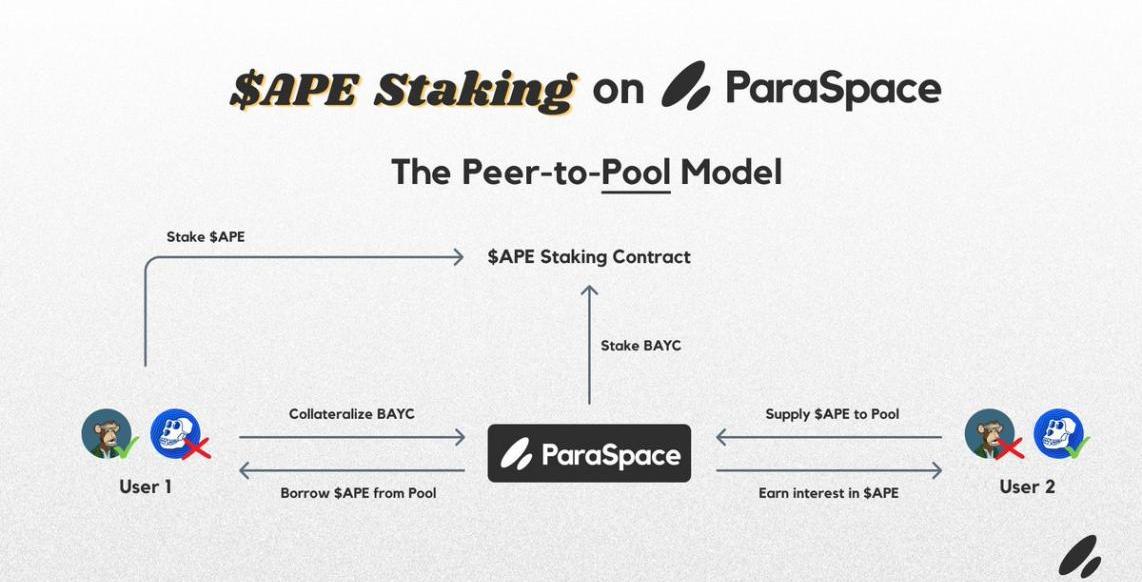 首先,ApeNFT的持有者在ParaSpace平臺上質押NFT后,可以從APE借貸池中借出所需配對的APE代幣與其NFT進行配對,而無需找到特定的APE代幣持有者,讓其把代幣質押配對給自己的NFT,極大的降低了市場摩擦。同時,APE代幣的持有者只需向ParaSpace借貸池中存入自己的APE代幣,就可以獲得以借貸利率形式獲利的APEStaking激勵。