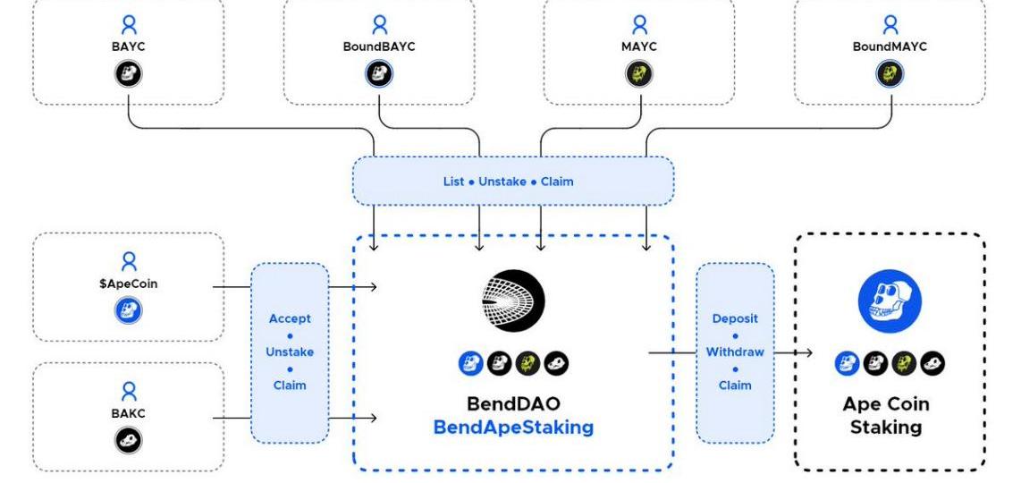 BendDAO對于絕大部分的NFT藍籌玩家都不陌生,平穩運行了近9個月的時間,在此期間BendDAO也經歷了藍籌NFT價格的劇烈波動導致眾多NFT進行清算的問題。在不久前也曾經被行業質疑是否會成為藍籌NFT價格進入死亡螺旋下降的罪魁禍首以及壞賬的解決能力等,但是伴隨著產品不斷迭代升級,以及通過社區提案決策修改重要參數等努力,BendDAO用數據和時間證明了其在NFTFi領域的龍頭地位。因此在ApeStaking的活動中,BendDAO也是一個非常重要的第三方參與平臺。