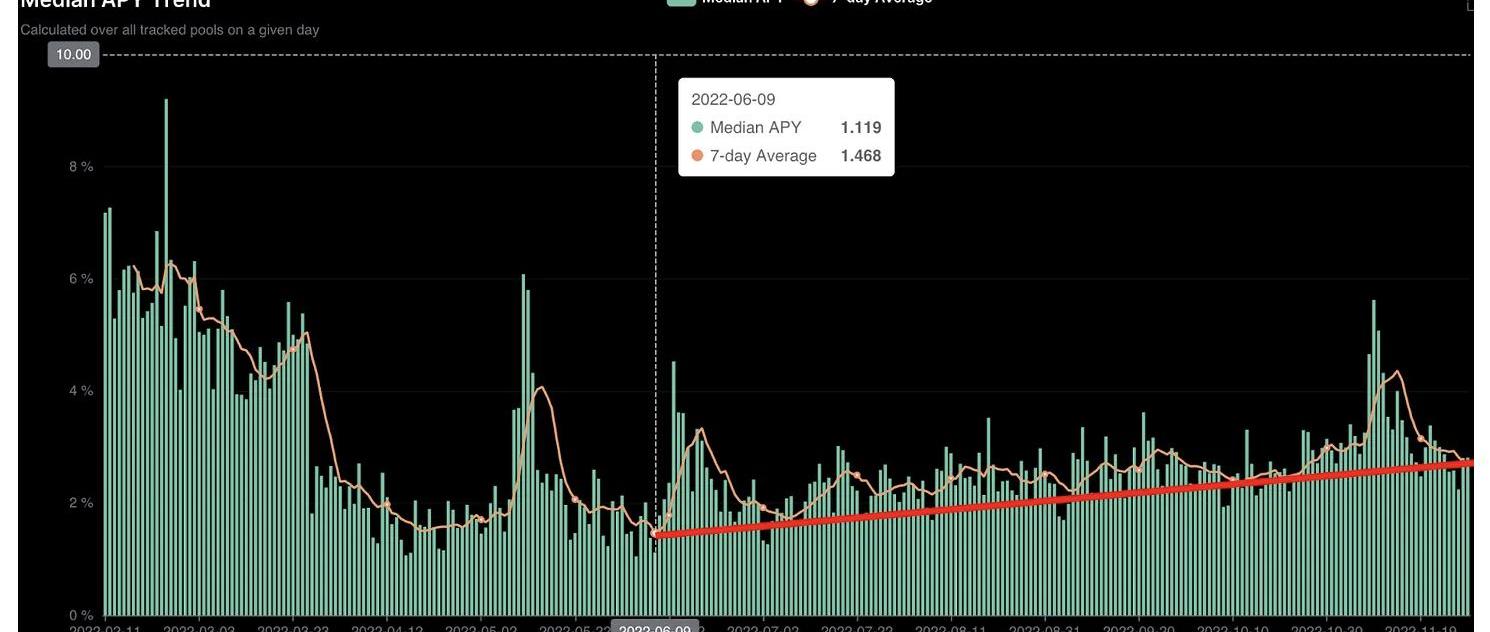 自6月9日觸底以來,DeFi的聚合收益率一直在上漲。