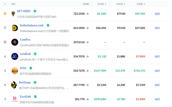 火幣生態鏈HECO上的NFT項目也有不少,如收藏品類DeFi+NFT的NFT HERO,游戲類SOVI、ATTN、GameDAO、IslandEconomics(IEC),基礎設施類BeeSwap。