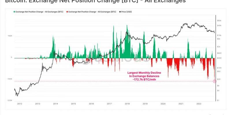比特幣目前正以每月-?172.7?萬的速度流出交易所,超過了?2022?年?6?月拋售后創下的前一個峰值。
