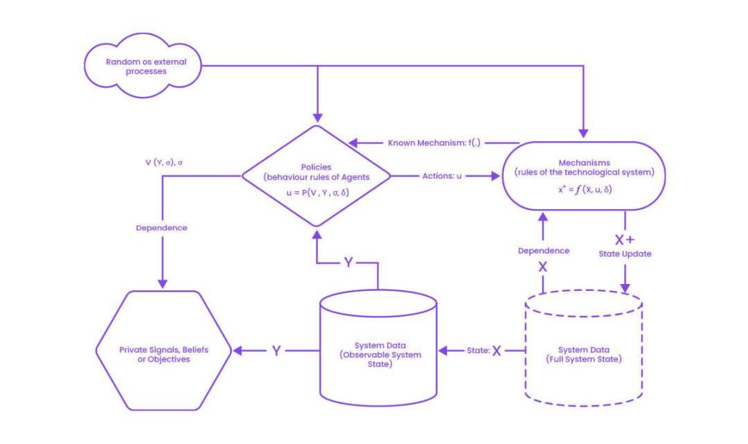 為了找到在不同市場條件下保持系統穩定性和可持續性代幣的最佳決策模型,工程師會利用圖1中顯示的部分或所有學科知識來創建數據驅動模型或數字孿生。Zhang等人提出了一種基于節點的加密生態系統的建模方法。他們在技術系統中開發了節點需遵守的基本規則及其行為策略的通用模型。圖2顯示了該模型的高級數學描述。