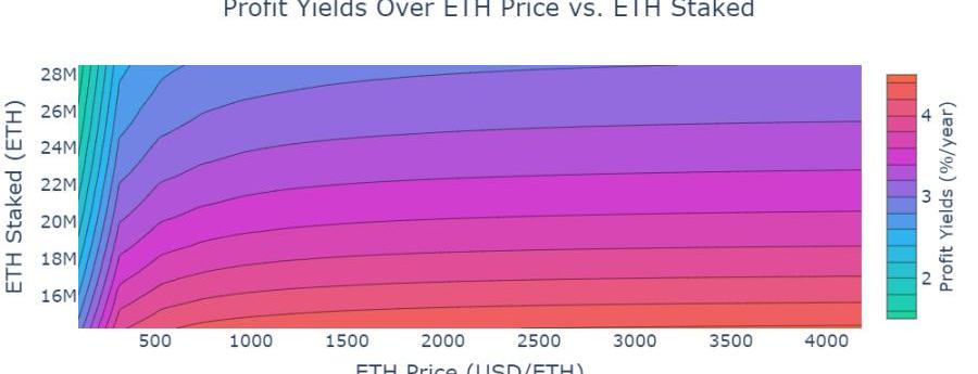為了在不同角度和假設下檢查L1區塊鏈,CADLabs開源以太坊radCAD模型做過許多預設實驗。通過將模型的給定合并日期調整為過去的某個日期,以太坊基金會可以顯示所有權益證明(PoS)驗證者在網絡中抵押的ETH總量和以美元計價的ETH價格不同的情況下的預期利潤率,如圖5中的顏色映射所示。