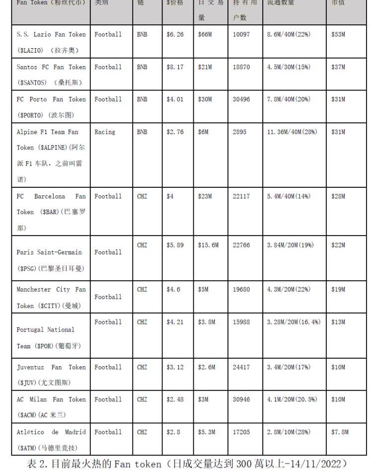 當前,主要的Fantoken大部分是由商業化的Fantoken發行平臺推出,Chiliz(CHZ)則是目前最大的Fantoken發行方。Chiliz在2018年完成6600萬美元私募融資后,開始進軍體育粉絲經濟,為各個球會提供及設計專屬的Fantoken。Chiliz(CHZ)與其推出的粉絲激勵平臺Socios.com目前發行的Fantoken已經超過了54種,部分Fantoken已經同時上線多個大型交易所與跨鏈到BSCchain(圖1)。與早期的社交代幣不同,商業化的Fantoken擁有更多的功能,其原因是商業機構把原有的粉絲經濟投射到web3上面。透過推出Fantoken,球會可以「固粉」,即保持明星與粉絲的互動,以加強粉絲對球會的忠誠,拉近了粉絲和明星的距離。這些活動及獎勵在未有Fantoken之前都難以實行。同時此類Fantoken也有多種方式賦能的探索,例如使用Fantoken投票,讓粉絲選擇球隊隊長袖標上的標語、獲得獨特的體驗如在貴賓區觀看比賽、進入足球隊體育場的后臺、以及擁有俱樂部物品的特別折扣等等。