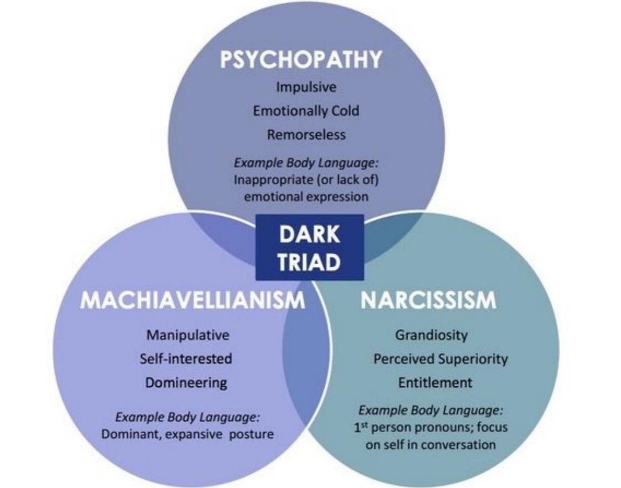 這三種特征往往可以混合在一個人身上,都有共同的行為模式,如自私、自我膨脹、傲慢等,但通常他們在表面上看起來都非常開放、自信和有魅力。