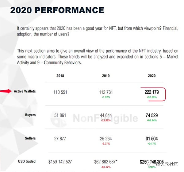 其實不僅flow,我們看到的像enj,mana,axs等這些NFT概念幣,他們本身還是erc20類的代幣,大多也是治理手續費之類的經濟模式,另外真實的用戶也不多,之前有份數據對2020年持有NFT非同質化代幣的用戶統計,活躍的地址大概是22萬個: