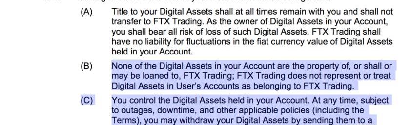 FTX的服務條款告訴其用戶:「你賬戶中的任何數字資產都不是FTXTrading的財產,也不應該或可能借給FTXTrading」。