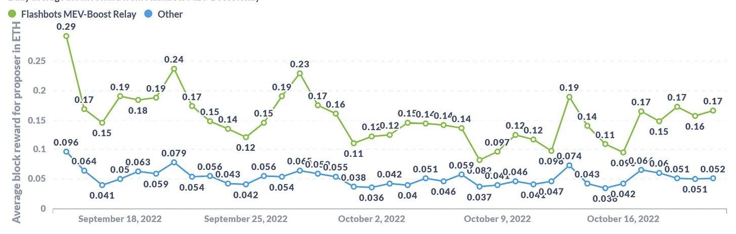 為什么要使用Flashbot?驗證者這樣做僅僅是因為為他們質押獎勵更有利可圖。Flashbots的軟件在提議者和構建者之間更公平地分配MEV價值,而不是在大型礦池和搜索者之間共享。Flashbots所做的是通過創建一個透明、開放的價格發現市場來阻止搜索者和礦工之間的這種內部勾結市場。根據Hasu的說法,使用MEV-Boost已將驗證者的合并后質押獎勵增加了135%。