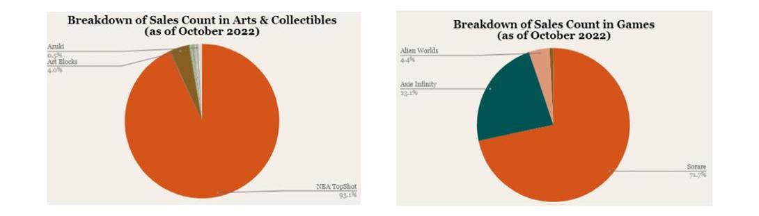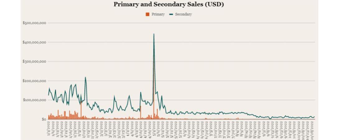 隨著今年資產價格的大幅下跌,不可替代代幣(NFT)市場經歷了艱難的幾個月。低迷的宏觀環境減少了整個加密生態系統的鏈上活動,隨著投資者降低風險曲線并平倉,價格從2020-21年的高點全面下跌。在這份報告中,我們提煉了各種指標,通過可量化的數據和深入的觀察,幫助你了解行業并解讀各種趨勢。今年下半年,藝術品、收藏品和游戲的每周交易量一直呈橫盤整理趨勢,這與ETH的價格走勢一致。然而,從每周的銷售統計來看,有一個明顯的偏差,即自2022年8月21日以來,游戲呈上升趨勢,而藝術與收藏品則持續下滑。