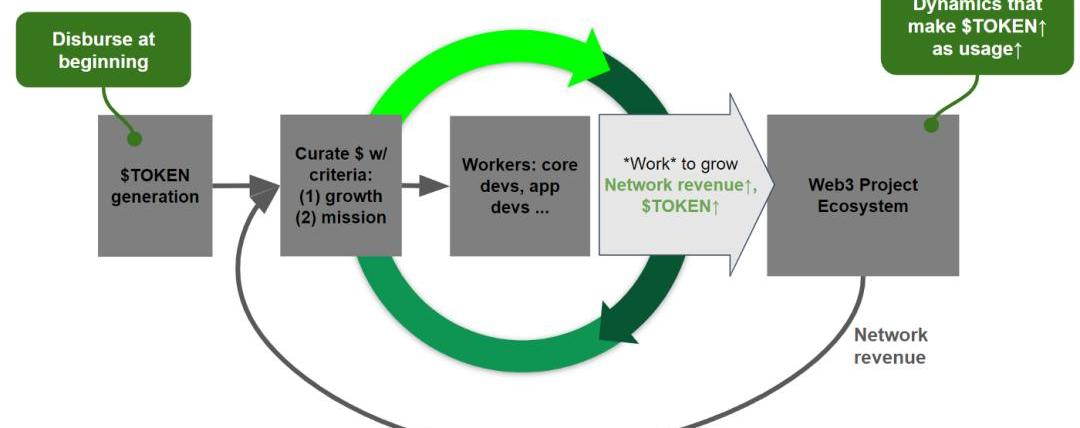 Web3項目沒有循環。挑戰是通證的供應不斷減少,沒有長期的可持續性。這方面的主要問題是,創始團隊需要不斷投入通證供應來為自己籌措資金。這樣供應繼續減少,特別是當項目必須轉向“產品-市場匹配”時,這一現象更為顯著。隨著每一次的稀釋,創始人保證項目獲得成功的動力就會進一步減弱。如果供應嚴重減少,團隊將需要出售公司股票或第二種通證,這可能會帶來激勵措施錯位的風險。我們能做得更好嗎?下圖展示了一些Web3項目正在做的改進。從公司和國家那里受到啟發,圖中引入了創收。收入然后以一種精心策劃的方式返回至工作者那里。項目的選擇基于增長潛力和與項目使命的一致性。資金可以流向創始團隊和其他項目團隊。他們都執行*工作*來增加通證價值和網絡收入。這樣循環往復下去。