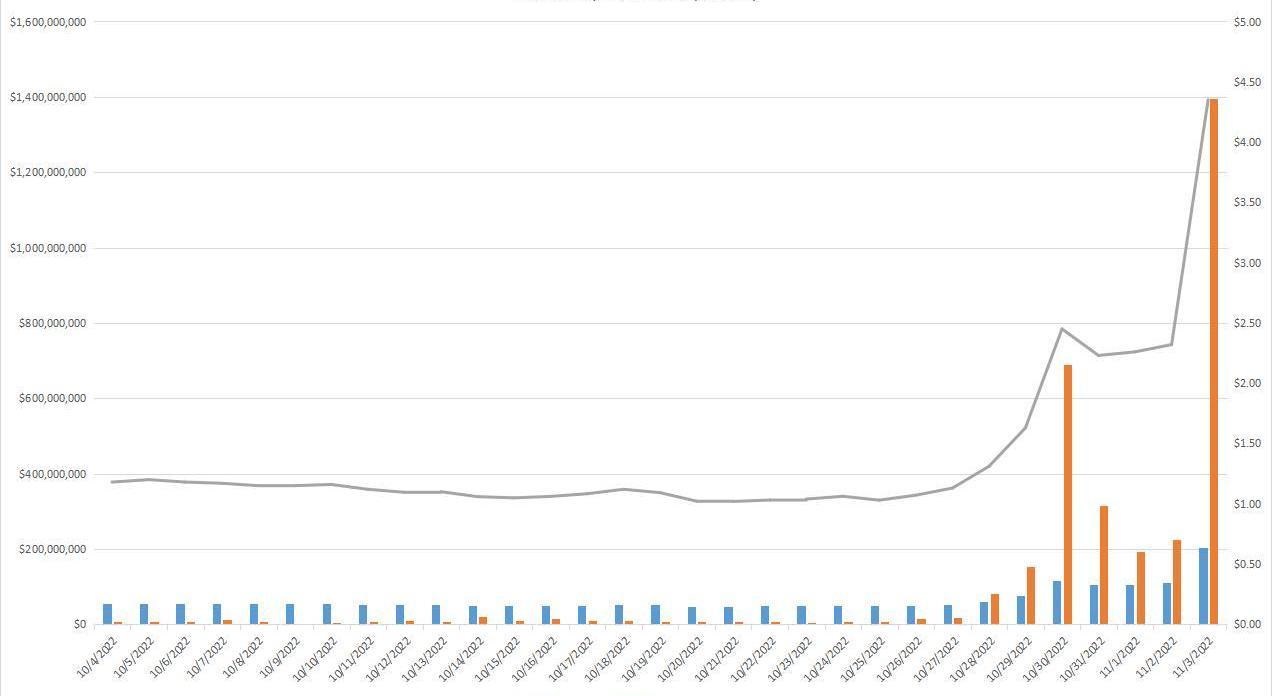 下圖是過去30天MASK的市值和交易量。自10月28日以來,MASK的交易量已超過其市值,最高為市值的6.8倍。這意味著MASK的價格將會產生巨大波動。