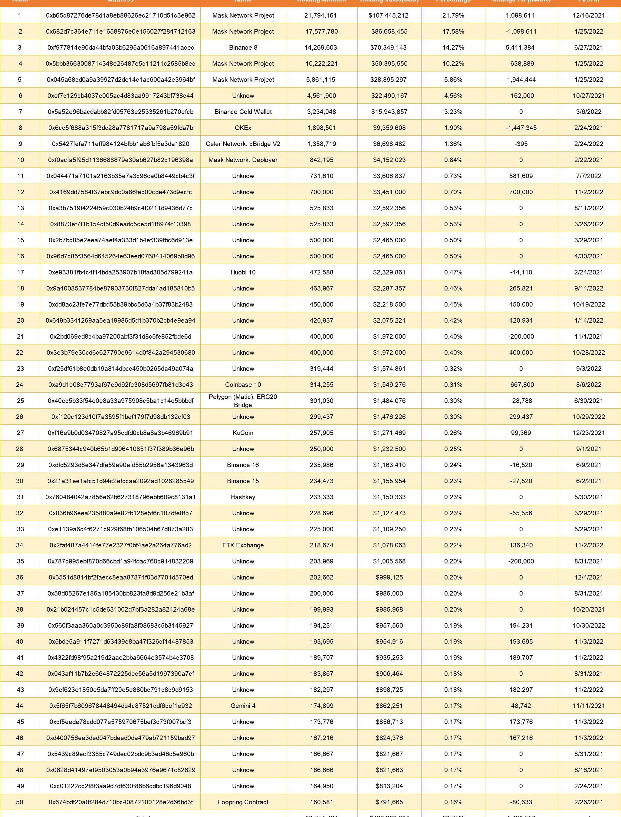 MASK前50名持有者共持有9375萬枚$MASK,占總供應量的93.75%。在過去7天里,他們總共積累440萬MASK。