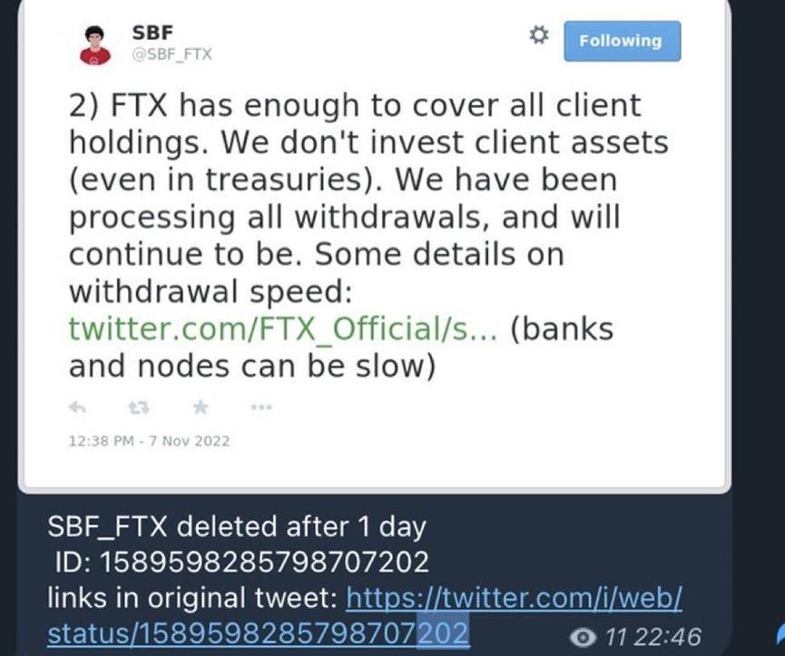 就在上述帖子發出的第二天,FTX美國和FTX國際都停止了提款并申請破產。