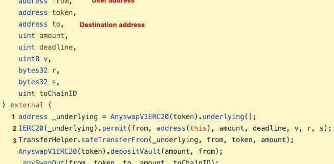 受攻擊的合約中,關注下圖標記的1,2,3行:首先,從anyDAI?這個合約拿到它底層資產合約的地址,即DAI。其次,permit()?使用戶通過簽名來允許路由器從用戶地址中提款。最后,safetransferfrom是一個真正的提款動作。