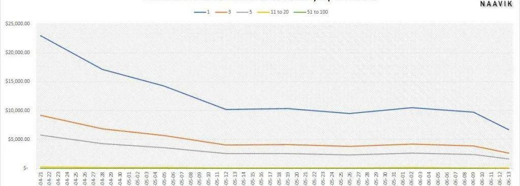 那么,Top100玩家實際上拿到了多少資金?我們不妨來看S20賽季給頭部玩家的AXS獎勵變化: