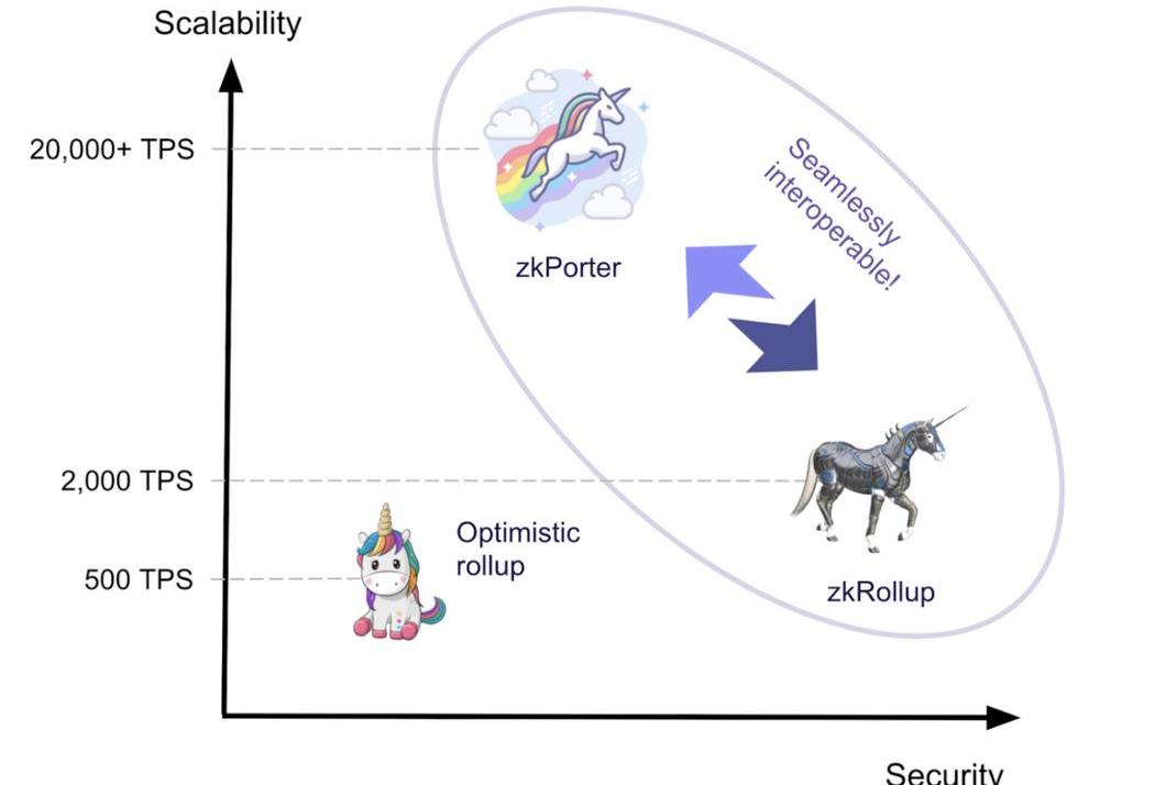 而zkPorter是zkRollup的進階擴容方案,這個方案與前者的區別是,zkPorteraccount的用戶將不會把狀態改變作為calldata更新至以太坊主網上,而是發送至由守護者組成的網絡。