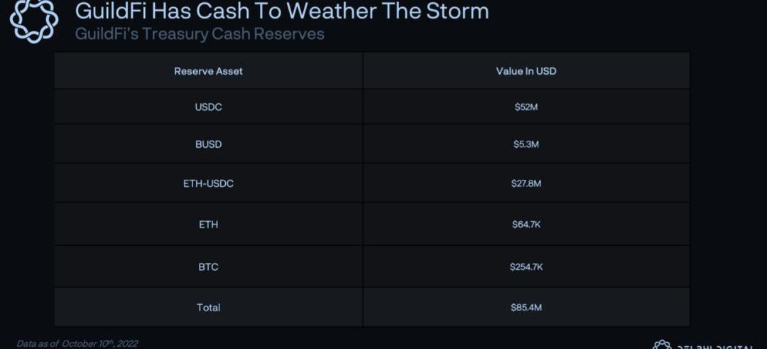 GuildFi的財政庫在本報告中的所有公會中擁有最大的現金頭寸。這不包括其他持有的token、種子投資以及NFT,其財政庫的現金總價值約為8540萬美元。鑒于當前的熊市,如此可觀的金額顯然對公會來說是一個切實的優勢。