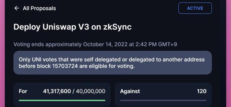 XRP/HKD-5.52%Uniswap治理投票剛通過了4千萬張"贊成"票,預計UniswapV3將在4-6周內在zkSync上部署。