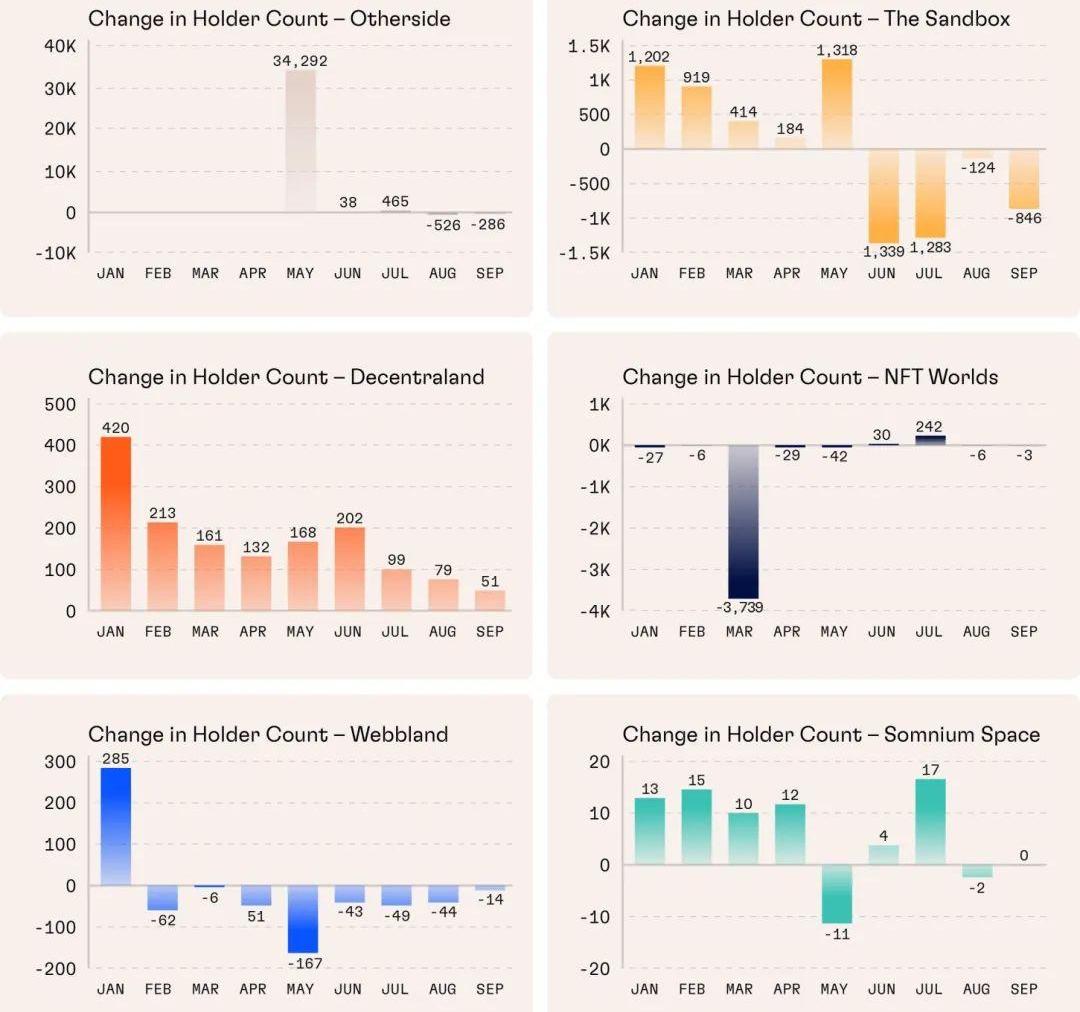 從歷史上看,錢包數量的變化幾乎總是正QoQ,這表明土地所有者的數量在增加。然而本季度,獨特錢包數量的變化是負數,這表明土地正在被已經持有土地的錢包所積累。Decentraland是個例外,盡管速度較慢,那里的獨特土地所有者繼續在增長。