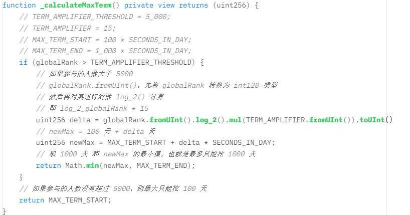 其中全局變量?globalRank?代表的是全局參與的總人數,只增不減。activeMinters?代表正在參與挖礦的人數,當用戶參與時間挖礦時增加?1,到期領取獎勵后減少?1。userMints?代表用戶的挖礦參數。我們看到,這里最短需要參與一天,最多參與的天數是通過?_calculateMaxTerm()?實時計算出來的。
