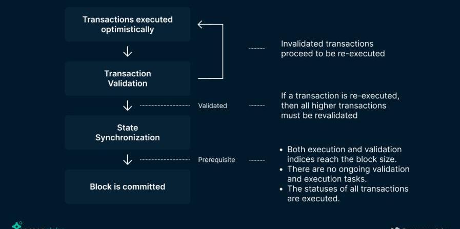 Aptos的并行執行利用Block-STM引擎,該引擎樂觀地并行執行批量事務并在執行后對其進行驗證,從而在給定特定順序的情況下最大化并行性。當發生沖突時,不成功的交易會被重新執行,所有更高的交易也會被重新驗證。