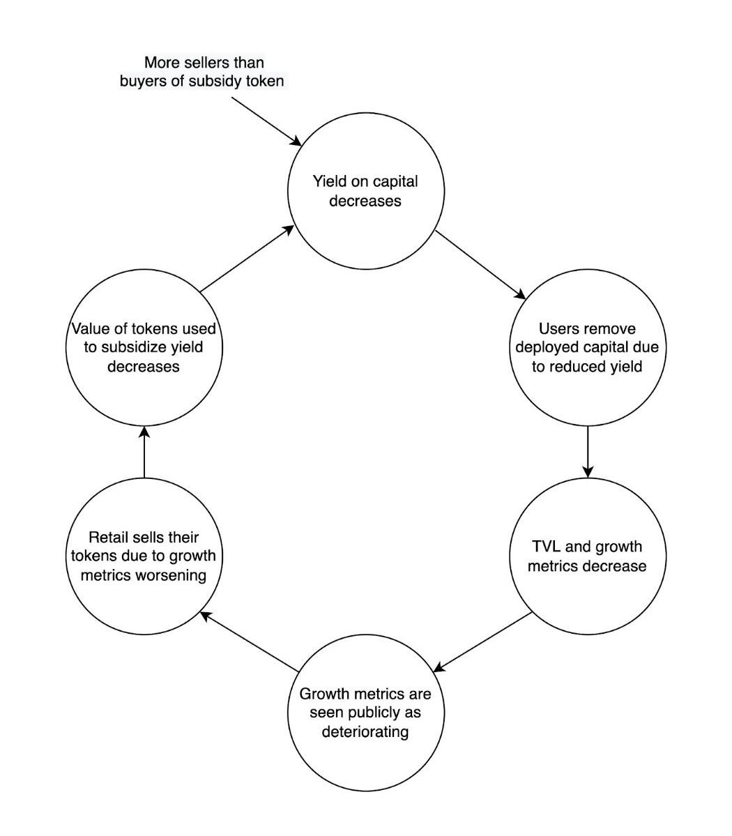 這導致TVL等非常重要的基本指標下降,這使得補貼代幣看起來不再像投資那樣有吸引力。隨著基本面的“改變”,那些投機代幣的人變得更加看跌并開始拋售。這會導致收益率進一步下降,從而導致更多資本流出,從而導致……并且循環加速。