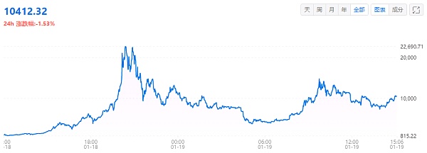 2013年12月比特幣達到了那次牛市的高峰8000元,然后便開始瀑布般下跌,在2014年至2015年這段周期在1800元左右橫盤。從8000元跌到1800元,已經跌去了將近80%。