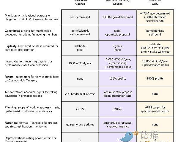 這里提及了Cosmos集會這個概念,是一個代表Hub社區利益的組織機構。它由ATOM持有者定義總體章程,DAO可以成為理事會,并會被添加到章程中,為特定主題提供資源和授權,Cosmos集會則由理事會的代表組成。