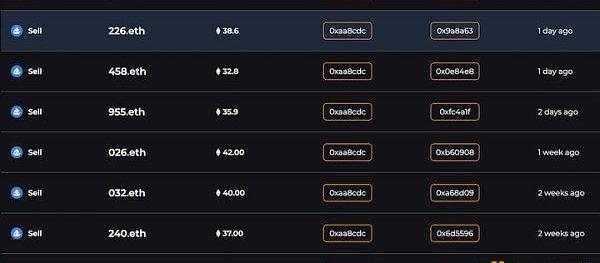 812.eth地址從去年11月份開始注冊近60個域名,絕大多數為三位數字域名和三位字母域名,主要通過出售三位數字域名獲利,從5個月之前開始共售出37個三位數字域名,近三周出售的9個三位數字域名的售價均在30ETH到43ETH之間。