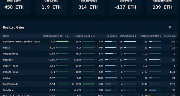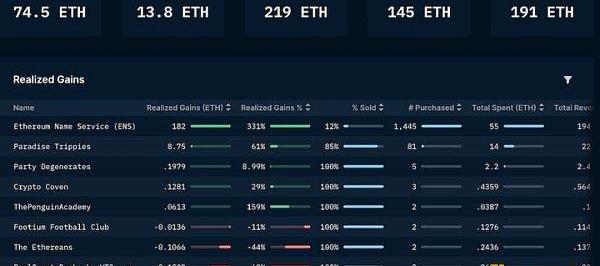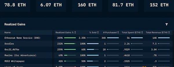 在已實現利潤榜排行第六的地址僅通過ensmaxisnft.eth獲得榜六地位,該域名在7月份以111.69ETH成交。