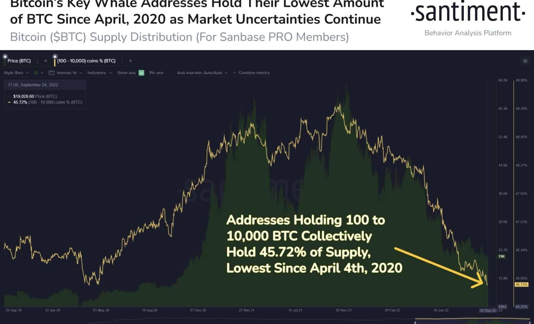 根據鏈上數據,比特幣鯨魚持有量連續100個月下降。根據鏈上數據提供商Santimenr的說法,在對通貨膨脹和全球經濟衰退的擔憂中,“持有100至10k美元BTC的地址已將其持有的#crypto頂級資產的供應百分比降至29個月低點”。
