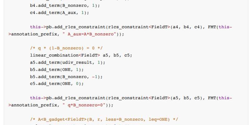 當然除了上述提到的一些指令相關的約束外,tinyram還有一些pc一致性、參數編解碼、內存檢查等各種約束。這些約束通過R1CS系統組合起來構成一個完成的tinyram約束系統。所以這也是R1CS形式的tinyram生成約束數量較多的根本原因。