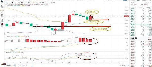 1小時盤面隨著昨晚沖高回落后,幣價開始在上軌下方1460附近開始震蕩,MACD拐頭上揚短期有波反彈,4小時KDJ緩慢形成死叉,總體行情還是看空。昨晚連續沖高受阻也說明上方壓力位很強勢,當前大方向而言依然沒有止跌一旦后續空頭再次發力行情或將延續震蕩下跌為主走勢。不過當前幣價與MA5日均線之間產生一道缺口加上短期內指標需要修復那么預計早上短期會出現小幅反彈走勢不過力度預估不會太強高點壓制參考在1480-1500一線即可也就是說昨晚到早間此輪修復性反彈無法有效突破上方任意壓力位后續日線收線后幣價將會繼續下跌走勢其下方低點支撐參考在日線BOLL帶下軌。