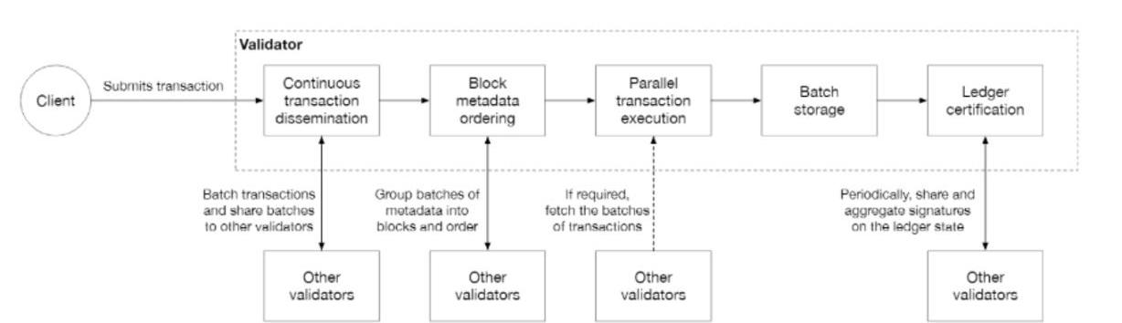 在交易發送的過程中,驗證者將把交易分組為批次,并在達成共識后合并進區塊。執行、存儲和賬本認證都是批量處理的,這種操作可以優化排序體系,減少操作步驟和并行執行。