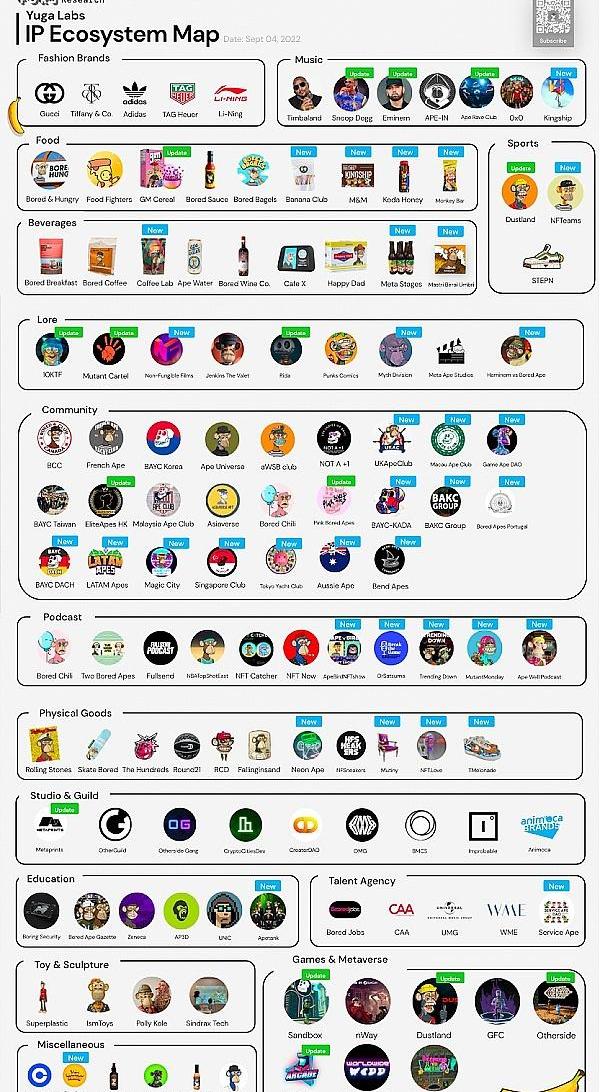 到目前位置,BAYC的IP生態版圖里已經整合了奢侈品牌、運動品牌、一線明星、9家知名行業投研機構、5家藝人經紀公司等,發行了基于BAYC生態的潮牌周邊、食品、電影及元宇宙游戲等。