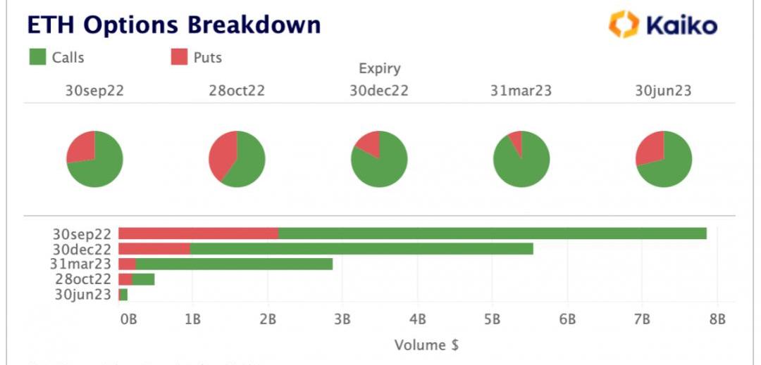 合并后期權到期日幾個月來一直看漲。在合并之后,9月30日的到期日似乎是ETH期權投資者的關鍵之一,屆滿時交易了價值近80億美元的期權,其中近75%是看漲期權。