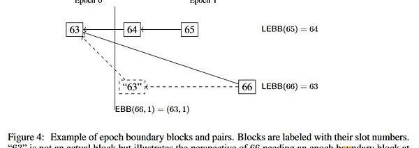 見證者的見證消息中不僅包含對當前最好區塊的投票,還包含了引向這個區塊的最新一個檢查點。需要指出的是,在Gasper中,檢查點是基于時段而非區塊高度的。每個時段都指向具體的一個檢查點區塊,要么是這個時段的第一個時隙中的區塊,要么是這個時隙以前的最新一個區塊。理論上來說,同一個區塊可以是兩個不同的時段的檢查點,所以,檢查點使用(epoch,block)對來表示。在下圖中,“EBB”是“時段邊界區塊”的縮寫,表示一個時段的檢查點;而“LEBB”則是“最新的時段邊界區塊”的縮寫,表示整體上最新的一個檢查點。
