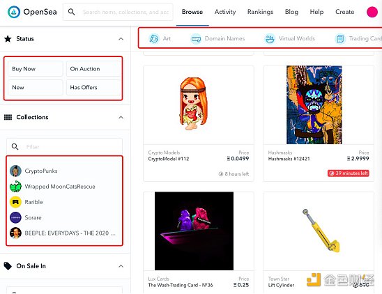 點擊OpenSea官網上方的「瀏覽」(Browse)即可選購NFT。在選購頁面中,可以隨意瀏覽自己想要購買的NFT,也可通過頁面左側的「Status」(NFT的狀態)、「Collections」(集合)或頁面上方的分類篩選NFT。