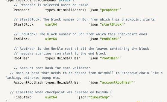 檢查點機制是一種將Bor層的數據同步到以太坊上的機制,其中同步的數據是檢查點,即在一個檢查點間隔的時間段內包含的Bor層區塊數據快照,源碼如下: