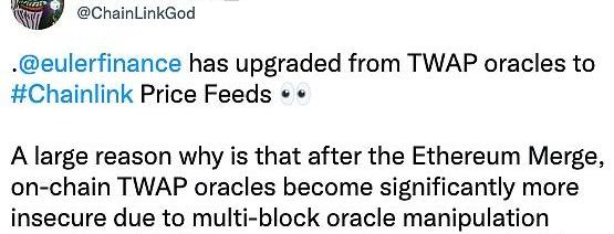 寫本文的動機其實就是看到了推特上有人說,EulerFinance從TWAP切換到Chainlink是一種升級(注意此人ID…==).