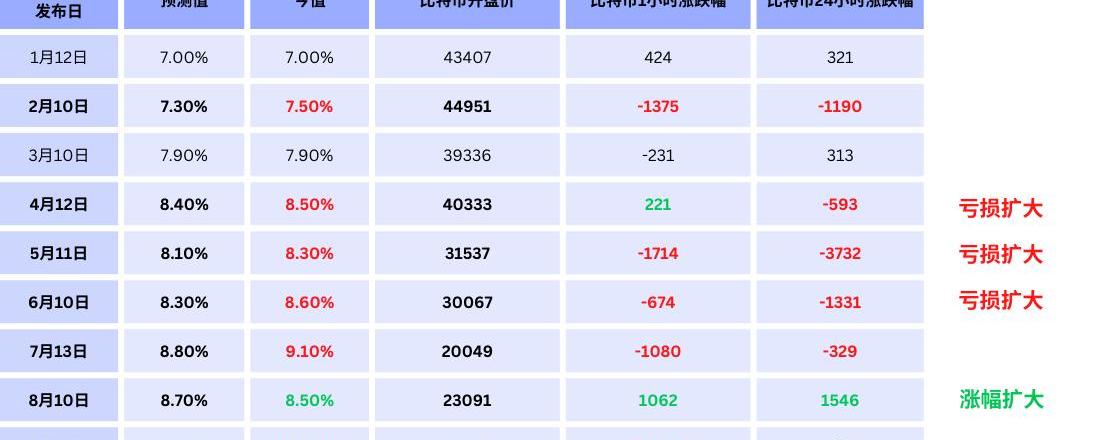 至于另外6次糟糕的通脹數據中,在報告公布后的第一個小時,比特幣錄得5次交易虧損記錄,其中3次的虧損在24小時后進一步擴大。如果只看數據發布后的24小時交易記錄,比特幣價格沒有一次高過其開盤價,也就是說糟糕的CPI必定讓比特幣下跌。
